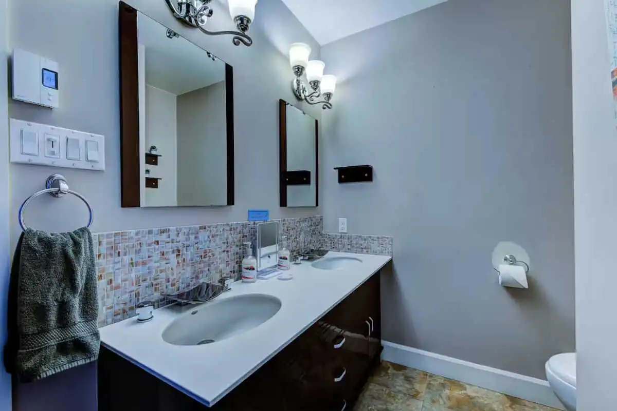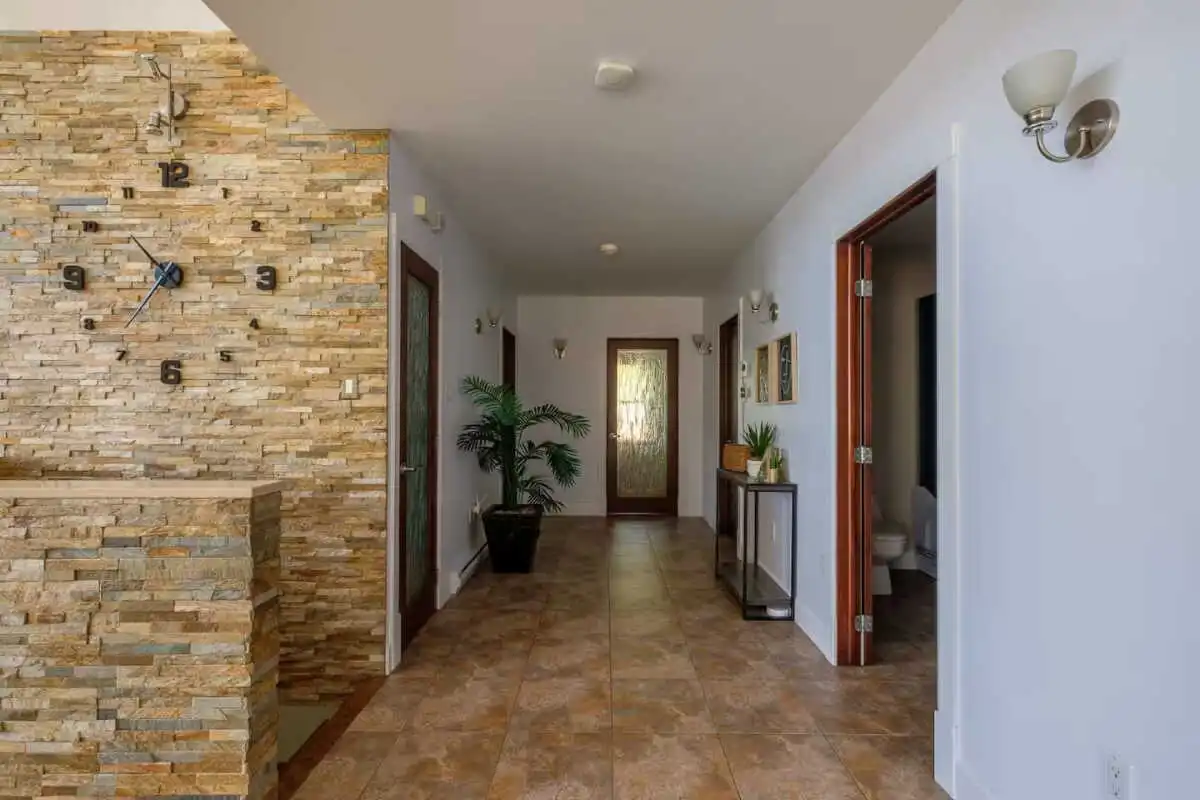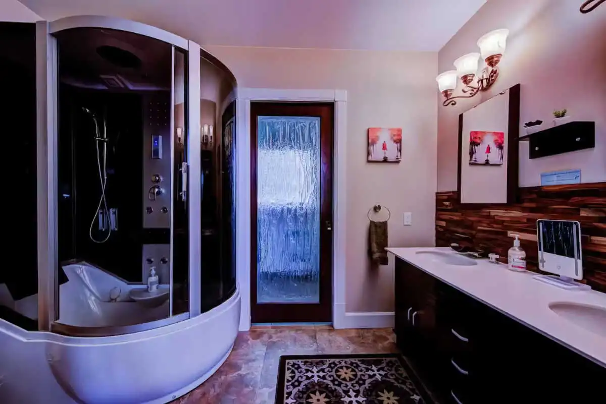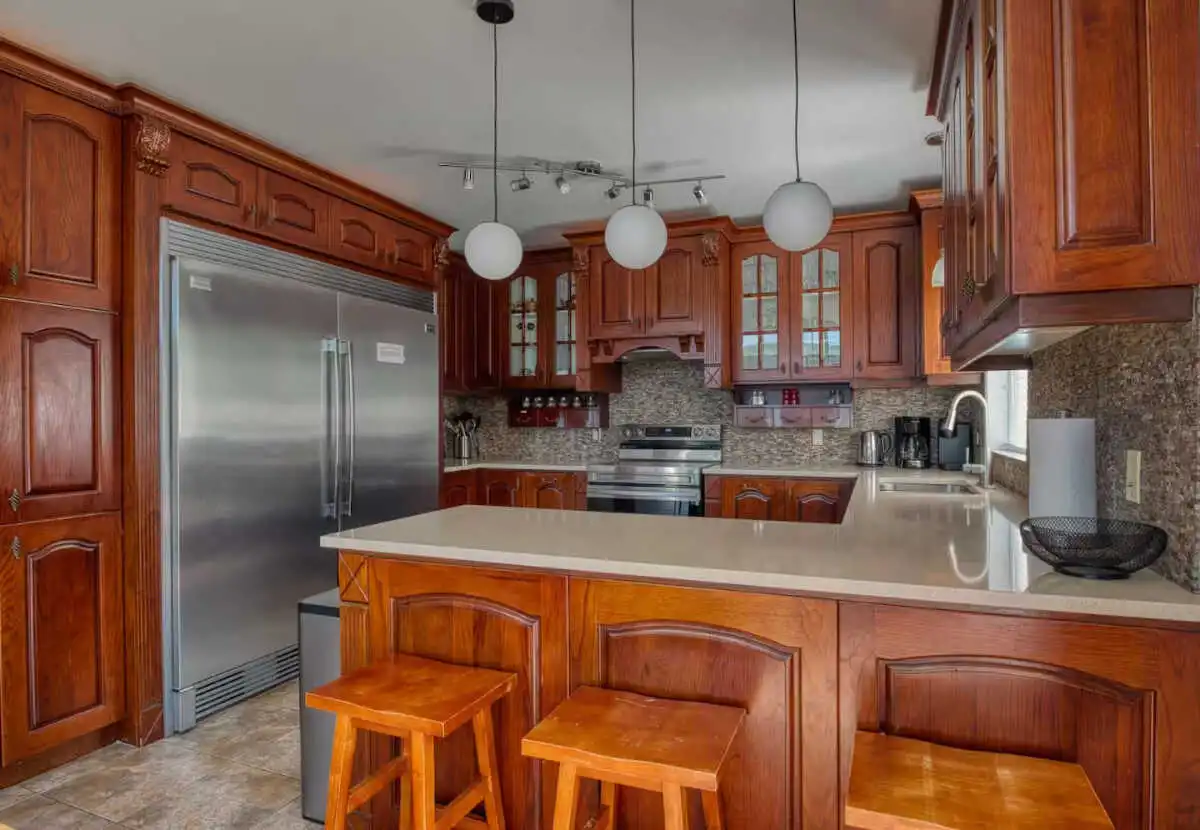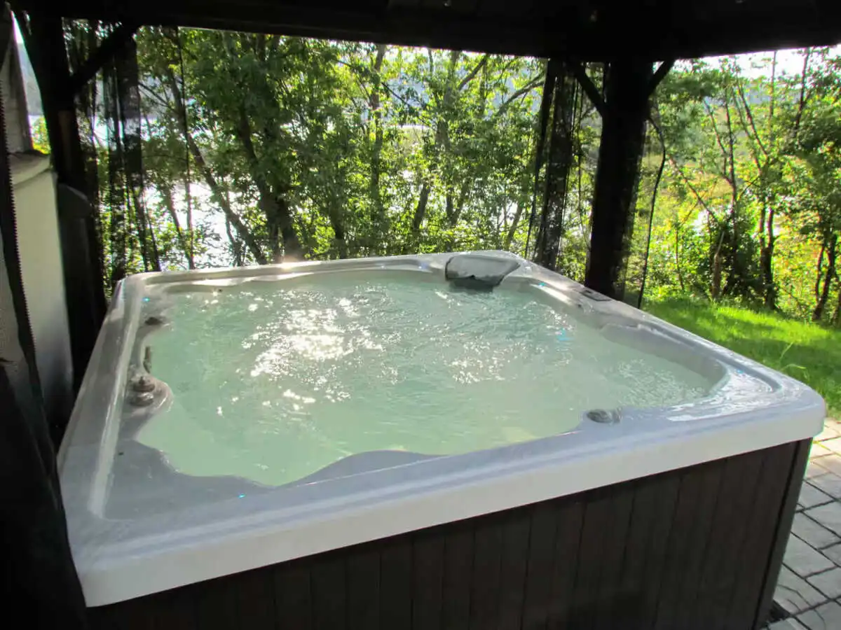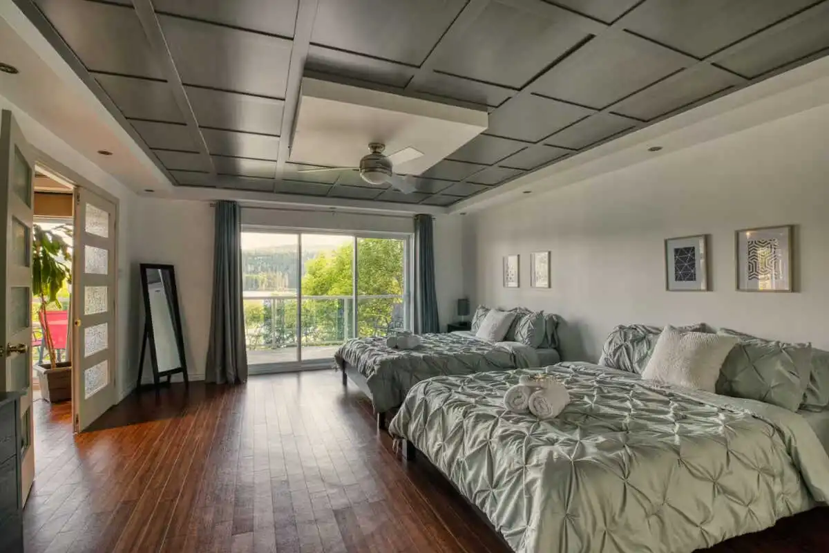 For added privacy, the master bedroom is adjacent to its private bathroom. Admire the outdoor space and splendid river views from the wooden patio (with outdoor fireplace), the dock or one of the large stacked glass balconies. Or warm up by the indoor fireplace in the generous cathedral-ceilinged main living room. Feel like cooking? A fondue stove and 4-season BBQ are also available to awaken the cook in you. Board games, a pool table and Wi-Fi internet access are available to keep young and old busy.
